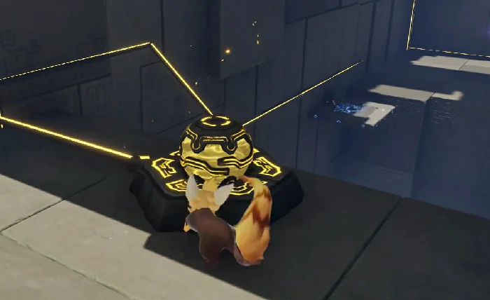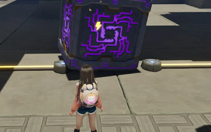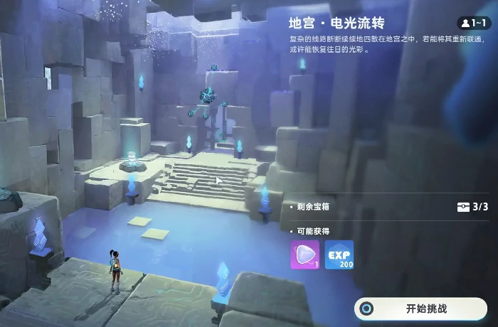 这个地宫坐落在闪电之森的正下方。刚进入的初始区域中央,能看到一段中断的电路,两端是裸露的电路节点,中间被一个木箱挡住。这时要操控附近的紫色电箱,用电箱推撞木箱让它移位,再精准把电箱放在两个节点之间,完成电路连接后大门就会立刻开启。第一个宝箱就藏在这个紫色电箱的后方,拾取后就能进入第二关。