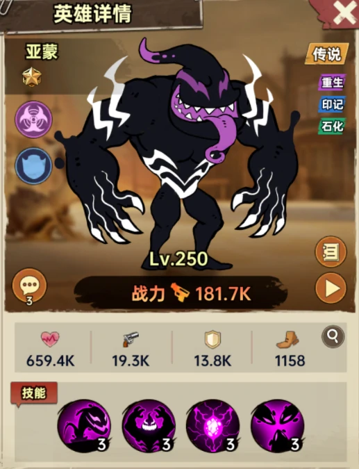 “石化触手”是他的常规输出技能,命中后除基础伤害外,还有概率附加1回合的石化控制效果。如果亚蒙在当前回合遭到敌方攻击,就会自动激活被动技能“致命寄生”:立刻对攻击者造成一次高额伤害,还有几率恢复自身最大生命值。他的标志性被动“不死之身”带来了极强的反杀潜力——当生命值归零时,亚蒙会暂时离场;但进入下一回合后,就会满血回到战场,这个效果无法被驱散或封印。