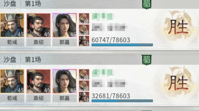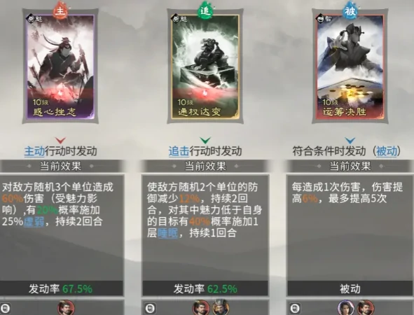 天赋系统是本阵容的核心驱动力。袁绍的“四世三公”拥有60%发动率,可在回合开始时施放全体伤害,并随机为目标友方单位叠加属性增益,全程累计下来的增益幅度相当显著。荀彧的“王佐之才”为团队提供双重保障:直接提升袁绍11%攻击与防御,同时增加15点四维属性,并赋予受加持单位触发兵力护盾的概率;每1点智力还能额外提升护盾的生效几率。郭嘉的“十胜十败”则聚焦智力博弈,智力比拼获胜后可造成群体伤害,并叠加“胜机”状态,进一步放大后续的输出收益。
