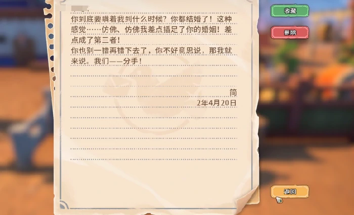 在这款模拟经营游戏里,玩家既能体验种田、建造、交易这些自由度拉满的生存玩法,还能和多位性格迥异的异性NPC发展深度社交关系。等好感度达到特定阈值,就能触发恋爱剧情,正式确立恋人身份。不过要注意,这段关系并非牢不可破,一旦操作失当,系统就会发放分手信,标志恋爱关系正式终结。接下来就为大家全面解析分手信的触发机制、挽回方式及关键注意事项。