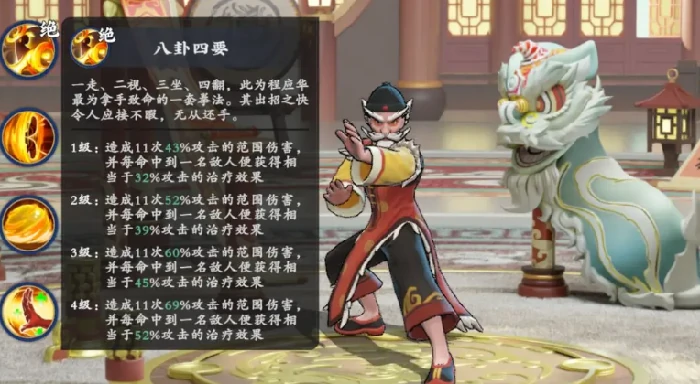 最后一位是程应华——站桩续航型的中坚战力。他的掌法绝技能发动11段范围连击,每段造成自身攻击力43%的伤害,总伤害倍率相当可观;命中敌人后,会根据命中数量触发等同于自身32%攻击力的生命恢复效果。这个回血机制会随着攻击目标数量线性提升,所以把他放在中排位置,既能吸引火力,又能最大化治疗收益。随着战斗进行,他的生存能力和持续输出效率会同步提升,是中后期阵地战里不可替代的稳定输出点。