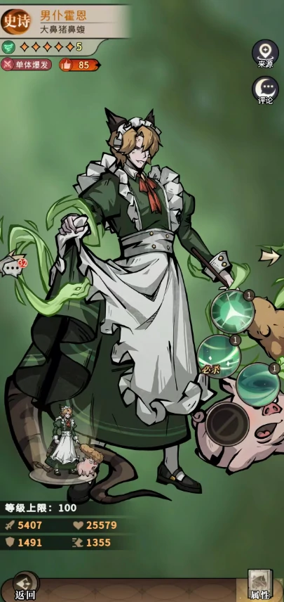 男仆霍恩还带有被动增益效果:每回合开始时,会根据技能等级获得属性加成,基础为10%攻击力与5%生命值,技能升至3级后,该加成可提升至20%攻击增幅与10%生命增幅。不过要注意,这个角色即便觉醒后仍偏重于前期过渡功能,中后期建议搭配具备群体压制或范围控制能力的蛇灵补强阵容,以此弥补单点输出的战术局限性。