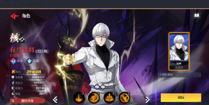 第二个推荐的是有马贵将,他还有个响当当的外号“白色死神”,核心特色技能是召唤落雷进行范围攻击,落雷覆盖范围内的所有敌人都会受到200%的核能伤害,每击中一名敌人,他自身就能获得100%的攻击加成,同时还能恢复部分生命值;觉醒后他更是能驱散敌人身上所有正面增益效果,甚至还能把自身的负面状态转移给全体敌人,面对靠增益叠加打输出的敌人时,他的压制力堪称无解。
