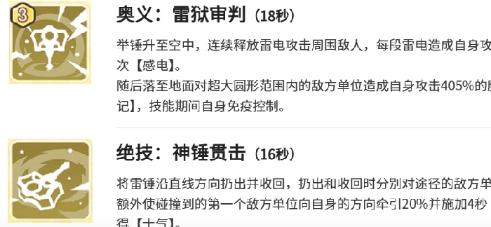 索尔的技能组衔接流畅,能让他在战斗中节奏把控张弛有度。雷狱审判堪称团队战场的收割利器,冷却时间约18秒,冷却结束后索尔会接连释放雷电攻势,造成多段49%的魔法伤害,还能给每个目标施加3次感电效果。技能收尾的落地重击更是覆盖超大范围,而且释放技能全程索尔都处于免疫状态,就算战局混乱,也能稳定输出。神锤贯击则是索尔的先手杀招,冷却16秒,战斗一打响就会自动释放。