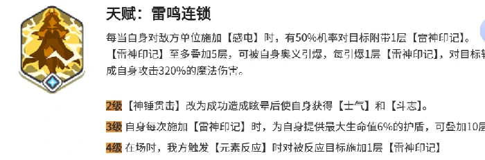 索尔的核心亮点要属雷神印记机制,这一切都依托于他的雷鸣连锁天赋。每当索尔给敌方挂上感电效果时,就有50%的概率给目标叠加一层雷神印记,最多能叠5层。等开启奥义引爆这些印记后,每一层都能对目标及周围敌人造成320%的魔法伤害,密集的范围伤害能瞬间冲散敌方阵型。而且随着天赋等级提升,索尔的输出和生存能力都会同步增强,满级后还能额外获得8%生命值加成,以及320点闪避属性。