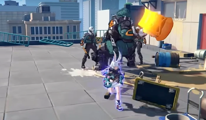 塔菲还能利用吸引装置,把场景里的高危油桶砸向敌人,紧接着用骑士战斗技能点燃油桶引发爆炸伤害。而且骑士技能自带位移效果,能让塔菲巧妙避开爆炸的危险区域。