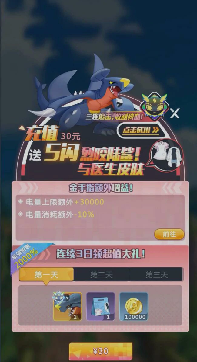 如果玩家选择充值30元档位,就能拿到海量养成素材,比如金币、经验药水等等。另外,游戏里的嘉年华活动也值得参与,这个活动的核心是快速攒积分,再搭配对应的充值档位,玩家就能兑换到超级暴鲤龙这类强力精灵。