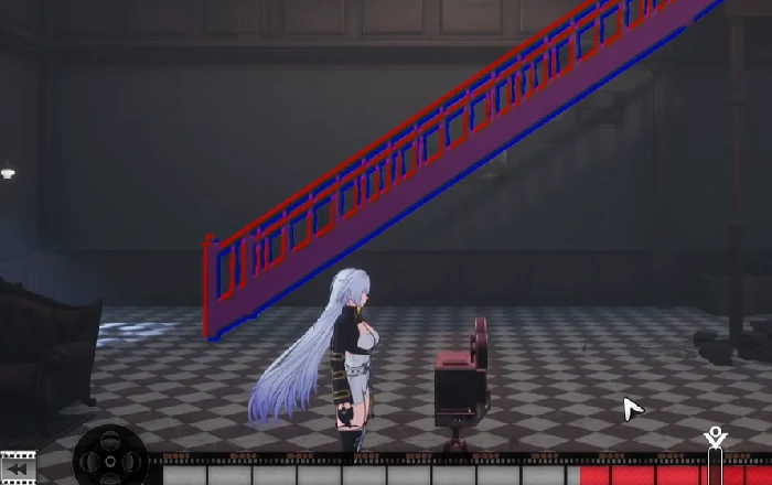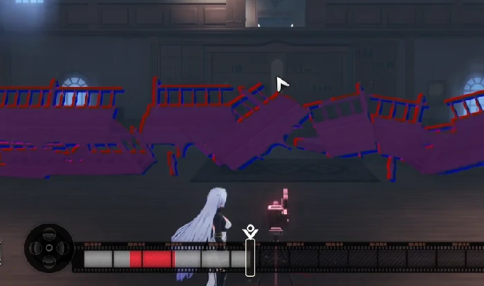 抵达二楼房间后,这里也有一台放映机,不过这次选播放影片没有任何反应,得点击关闭按钮,面前的大门才会开启。进入下一个房间,眼前依旧是一台放映机,和它交互召唤出坍塌的楼梯,尝试拖动进度条修复时会发现楼梯无法完全复原,只要把进度条拉到红色区域,就能直接登上楼梯。