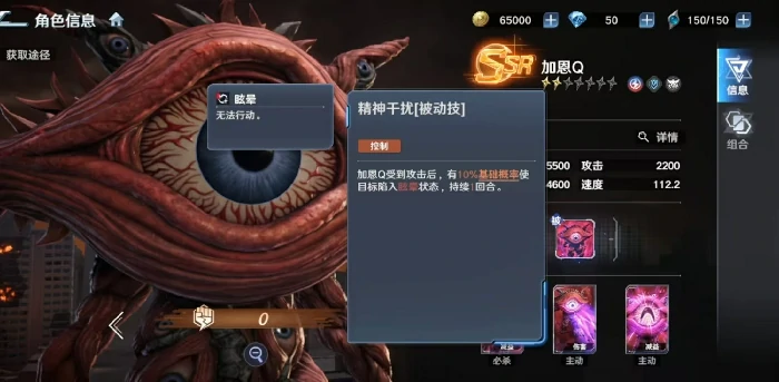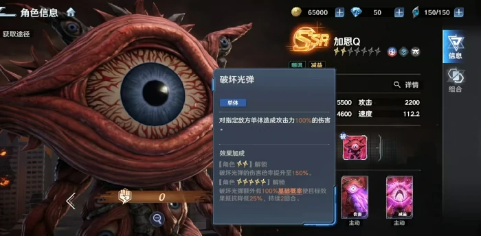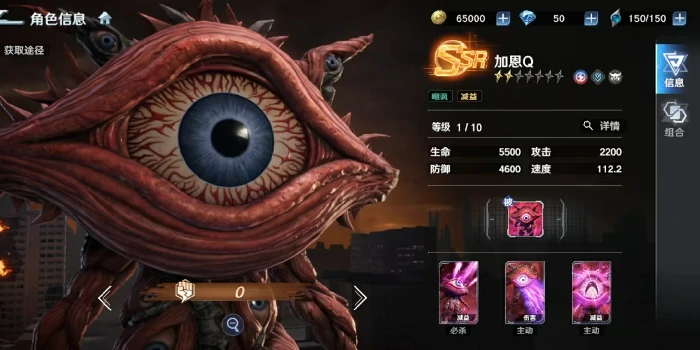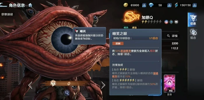 它的必杀技吸收光线是单体高伤害技能,命中后会给目标附上迷茫状态,让目标直接跳过下一回合行动,还会额外承受相当于自身攻击力100%的真实伤害。这个效果既有硬控能力又有补刀价值,但受限于单体范围和概率机制,在需要AOE的场景里表现会受限。一技能破坏光弹除了基础单体伤害外,还能降低目标10%的效果抵抗属性,大幅提升队伍整体异常状态的命中率;三技能嘲笑之眼是群体嘲讽技能,初始概率不高,随着星级提升最高能到70%,而且每升1星还会额外给加恩Q增加一定数值的护盾,进一步强化它的站场续航能力。