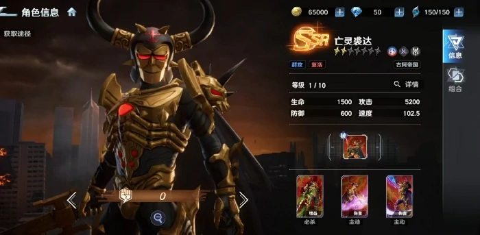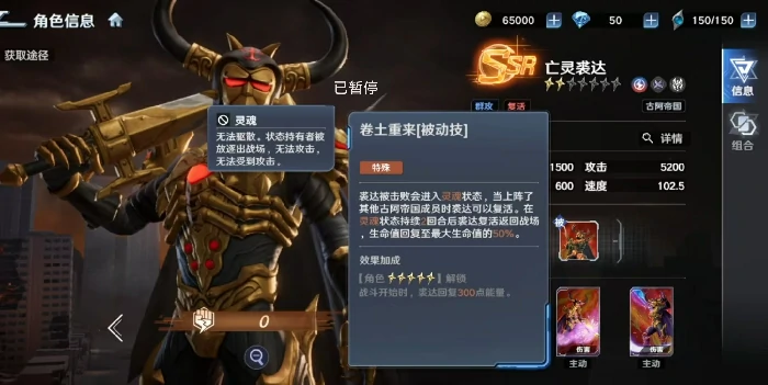 亡灵裘达有着辨识度很高的外观:一对巨大的弯角,归属于古阿帝国阵营,核心定位是兼顾持续作战能力和群体压制力的战术型输出。他的被动技能卷土重来给了他独一份的生存保障:被击败后不会直接离场,而是进入灵魂状态;如果当前队伍里还有至少一名其他古阿帝国角色,比如亡灵摩尔德、亡灵基娜等,就能立刻复活并回复一定生命值。这个机制让他在持久战和多轮次战斗里稳定性大大提高,但要注意的是,复活触发必须有古阿帝国阵营队友在场,没有阵营支持的话这个被动就没法激活。