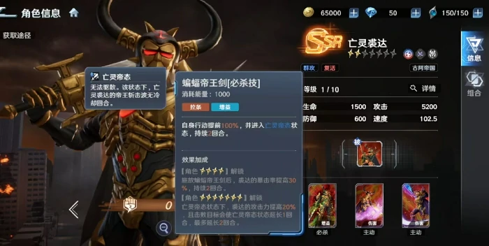 主动必杀技蝙蝠帝王剑是他的核心爆发技能。释放后亡灵裘达会立刻进入亡灵帝态,这个状态有三个核心效果:行动顺位提前100%,也就是本回合第一个行动;帝王斩击波技能冷却直接清零,能连续释放;同时获得暴击率和攻击力的双重加成。更重要的是,如果在这个状态下成功击杀任意敌方单位,亡灵帝态还能延长一回合。这也就意味着,操作得当的话,这个状态能实现多回合不间断的高频输出循环。