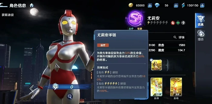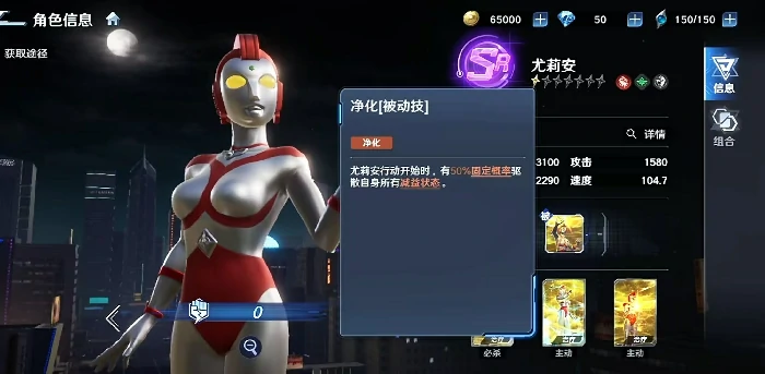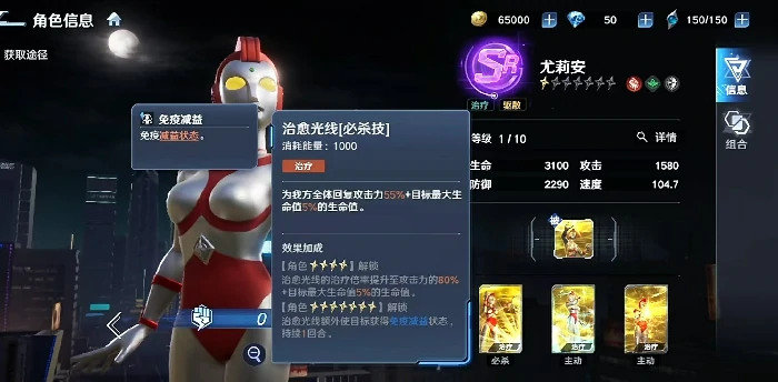 尤莉安的核心输出与支援能力体现在三个技能上:必杀技“治愈光线”可以为全体友方单位恢复生命,治疗量同时受尤莉安的攻击力和目标最大生命值影响;随着星级提升,最高能额外获得80%攻击力加成和5%最大生命值比例的治疗效果,还能给目标加上“免疫减益状态”的效果,大幅削弱敌方靠异常状态压制的体系。另外两个主动技能,一个覆盖单体精准治疗+随机敌方伤害,另一个实现群体治疗+为每名友方驱散1个减益状态,构建起多维生存保障网。