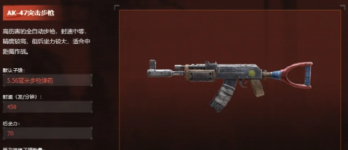 高伤害全自动步枪,理论射速450发/分钟,单弹匣容量30发,后坐力数值为70,单发与短点射的精度表现良好。虽然射速处于中等水平,但凭借扎实的伤害基数和稳定的弹着分布,在中距离持续交火中具备显著优势。使用时需把控好压枪节奏,建议搭配握把类配件进一步优化操控手感。