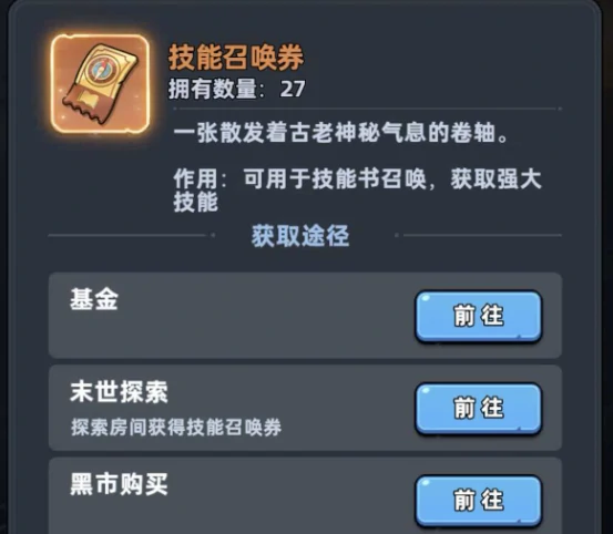 这里关键要开通技能书基金,每次角色进阶都能拿到固定的技能书,相当于白嫖福利。另外别错过末日世界探索,地图里带开门图标的房间,进去就能拿到召唤券。黑市虽能直接买召唤券,但一张要150钻石,成本不低,建议等后期钻石充足后再考虑。另一条路径是场景探索,室内探索主要拿召唤券,但高难度节点有机会开出完整技能书,尤其是限定款,运气好能省不少事。