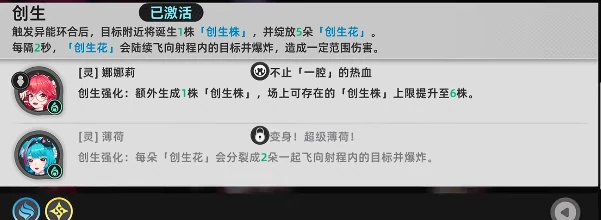 薄荷入场后就能触发更多环合层数,后期在强化效果加持下,创生株不仅会分裂得更多,攻击结束后还能额外生成1株,最多可对敌人发起20次连续攻击,强化后的坼绽效果还能不断叠加攻击层数。如果再加入娜娜莉,她的机制同样能让创生株数量再增加1株,让坼绽效果达到最大化,不过娜娜莉也需要依赖前期主角积累的能量来叠加效果。只要队伍同时包含光系和灵系角色,就能通过反复触发坼绽反应生成更多创生花辅助输出,叠满所有层数后,每株创生花的攻击次数拉满,队伍的循环伤害自然会大幅提升。