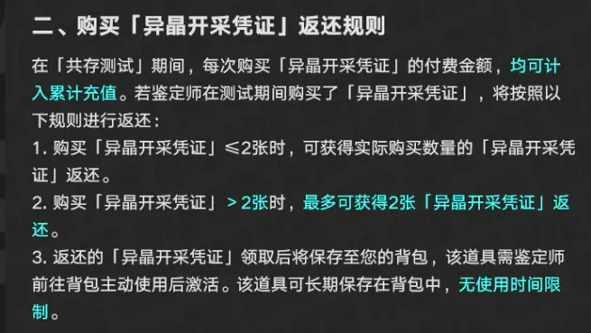 接下来是通行证也就是游戏里的异晶开采凭证的返还,规则相对复杂一点。测试期间购买这个凭证的金额,会先按照上面的异晶返还规则给你返还异晶,除此之外,还有凭证本身的额外返还:如果购买的凭证数量不超过2张,公测后会按实际购买数量返还对应凭证;要是买了2张以上,最多也只会返还2张。返还的凭证会以道具形式发放到背包,需要你手动在背包使用才能激活,而且这个道具没有使用期限,什么时候用都可以。