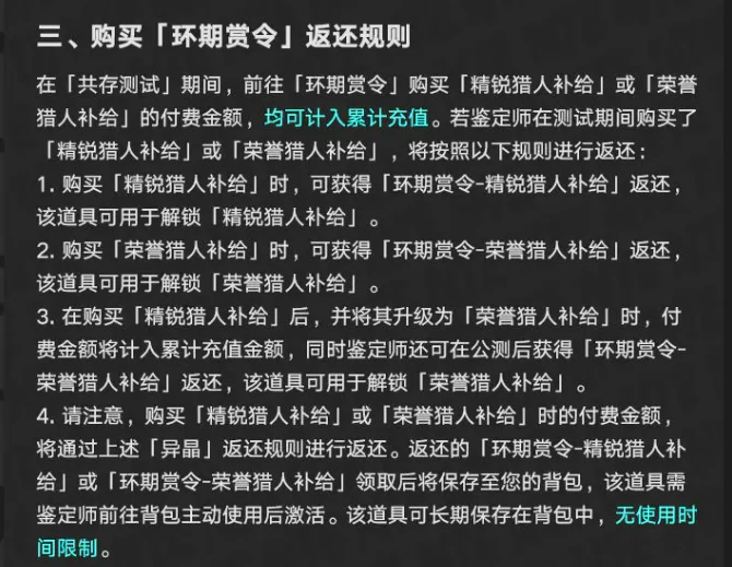 环期赏令也就是大家熟悉的战令系统,分为精锐猎人补给和荣誉猎人补给两个版本。测试期间买了哪个版本,公测后就会返还对应的解锁道具:买精锐版的返精锐解锁道具,买荣誉版的返荣誉解锁道具。要是你先买了精锐版,之后又升级成荣誉版,公测后会直接给你荣誉版的解锁道具。和通行证一样,买战令的金额也会按异晶返还规则给你返异晶,返还的战令道具也会放到背包,需要自行激活。