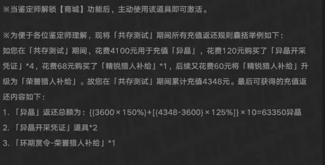 给大家举个实际例子就能更清楚了:假设测试期间你充了4100元买异晶,花120元买了4张通行证,先花68元买了精锐战令,之后又花60元升级成荣誉战令,累计花费4348元。公测后能拿到的福利计算如下:前3600元返还54000异晶,剩下的748元返还9350异晶,累计异晶63350个;通行证买了4张,但最多返还2张道具;战令因为最终升级成了荣誉版,所以直接返还1个荣誉战令解锁道具。