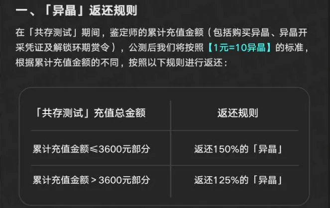 首先说核心的异晶返还规则。测试期间充值购买异晶,公测后将按照1元对应10个异晶的基础标准计算返还:充值金额在3600元以内的部分,会返还150%的异晶;超过3600元的部分,返还比例为125%。举个例子,要是你测试期间充了5000元,其中前3600元能返还54000异晶,剩下的1400元可返还17500异晶,累计能拿到71500异晶,这个比例在同类测试里算是很良心的了。