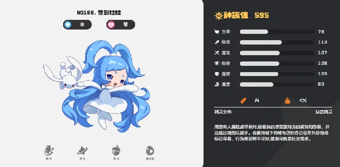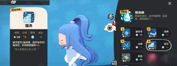 雪影娃娃的核心特性是捉迷藏,每给对手施加一次冻结状态,就能让敌方技能的PP值额外+1,利用这个特性能更好地牵制对手。技能搭配上,推荐选择霜天、穿堂、幼态延续和柔弱这四个技能。霜天技能能直接给对手施加两层冻结状态,随着精灵等级提升,冻结层数最多能叠加到四层。对手身上每存在一层冻结,所有技能的PP消耗都会增加2,靠这个机制就能慢慢耗死对手,快速限制敌方行动,通过冻结控场,为己方输出创造有利条件。