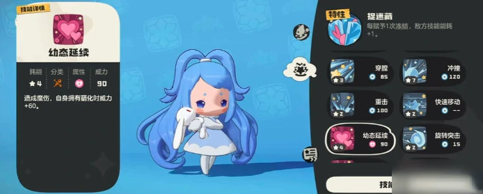 幼态延续和柔弱这两个技能则和雪影娃娃的萌系属性相关。幼态延续能对敌人造成魔法伤害,当自身处于萌化状态时,技能威力还能再提升60,打出高爆发伤害的同时,能快速压制敌方血线。柔弱技能不仅能让雪影娃娃进入萌化状态,还能直接削减对手70%的物攻和物防,这两个技能搭配起来,能适配不同的战局需求。