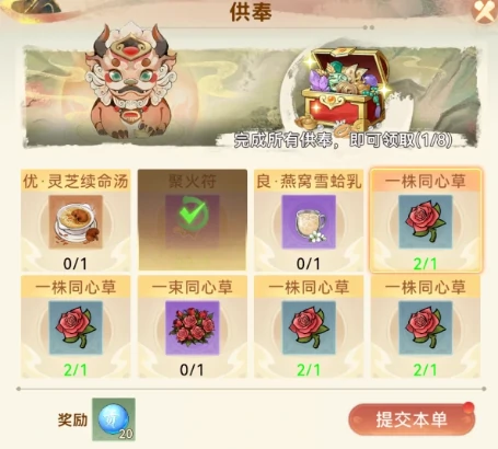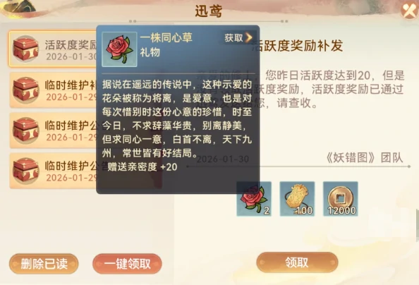 最后,每天完成日常任务累积活跃度,开启活跃度宝箱也有机会拿到同心草,这是个补充性的获取渠道,产出的都是日常能用得上的资源。玩家每天完成指定日常任务就能积累活跃度,达到对应数值就能开启宝箱,虽然宝箱里开出同心草的数量和概率会有点随机性,但每次开启都有机会拿到1到3株左右,新手阶段可以先用这个渠道拿到的同心草来赠送提升好感。