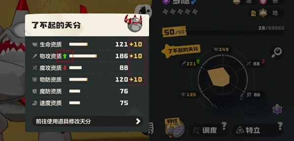 就像上图展示的那样,每只精灵的图鉴里都会明确标注种族值和个体值,哪怕是同一品种的精灵,个体资质也会有区别,比如标注‘资质平平’‘了不起的天分’等。所以玩家在野外批量捕捉精灵时,可以优先挑选种族值高、个体资质优异的来重点培养;另外,对于基础属性提升潜力大的精灵,还能使用贤者碎晶、首领碎片等材料炼制合成,打造出血脉更出众的个体,进一步拉高洛克系数。