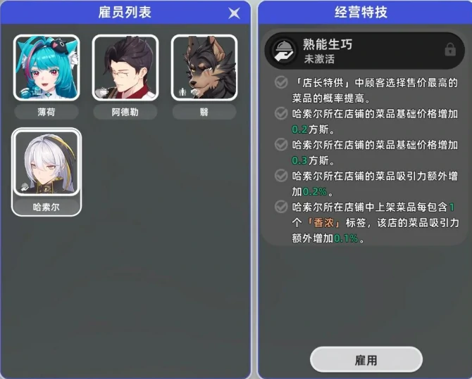 刚把店铺开起来,首要任务就是解锁实用的基础功能。进入管理界面后,右侧有个技能树按钮,点进去能看到众多可激活的技能。这里优先推荐点出哈索尔的“熟能生巧”技能,它的优势在于每完成一份咖啡或菜品制作,就能累积一点被动加成,长期下来员工出品的售价能稳步提升。至于招财猫功能,虽说看起来诱人,但它要求店铺等级达到3级,还得积累10次五星好评才能解锁,前期资源本就紧张,完全不用急着去解锁它。