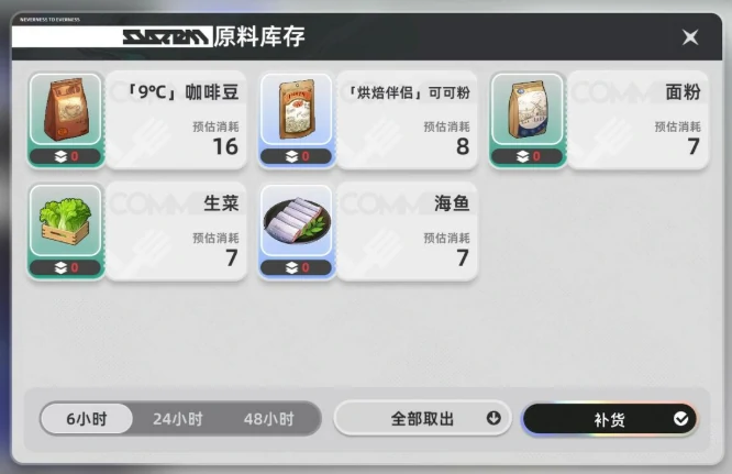 材料采购看似普通,实则直接决定了店铺能否稳定运营。左下角的供应链按钮点开后,可以选择24小时配送服务,虽然会多收取5%的配送费,但能省去手动采购的繁琐步骤。咖啡豆和可可粉属于高频消耗品,建议保持能支撑3天用量的库存;而薄荷和面粉保质期较短,控制在1天的用量就足够了,避免造成浪费。