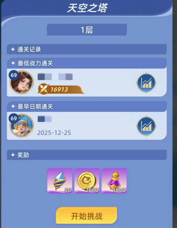 天空之塔一共有2500层,采用单向通关模式推进——每层仅可挑战一次,无法重复刷取。通关就能获取当层固定奖励,包含进阶石、金币及经验药水等角色培养刚需材料。由于层数不可回溯,整体收益分为两部分:一是突破新层数带来的即时奖励;二是基于历史最高通关层数发放的每日结算奖励。