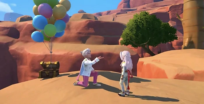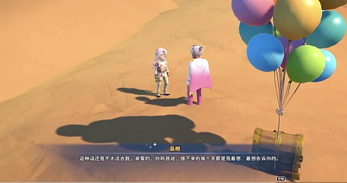 随后,装着戒指的宝箱会被气球牵引升空。受沙漠动态风力影响,气球可能突然偏离轨迹,这时洛根会果断拔枪射击,精准击破气球,确保宝箱平稳落到玩家面前。这个设计将动作演出与浪漫叙事融合,为后续环节铺垫了浓烈的情感张力。紧接着,他会单膝跪地,以标准绅士礼节当众告白。若玩家选择同意,两人便正式确立伴侣关系,之后可携手承接双人委托、组队探索未知区域,还能解锁专属婚后互动内容。