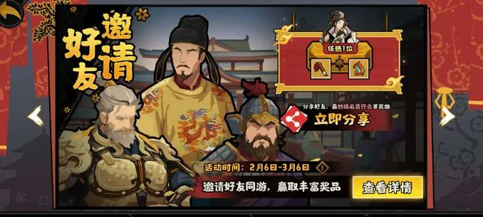 本次版本上线全新社交激励机制,成功邀请指定数量新玩家注册并达成活跃条件后,可领取妙级名臣自选宝箱,箱内包含许负、许慎、桓伊、伯牙、子期五位功能型名臣,覆盖占卜、典籍、音律、外交等多元领域,能有效缓解新手期阵容成型的压力。