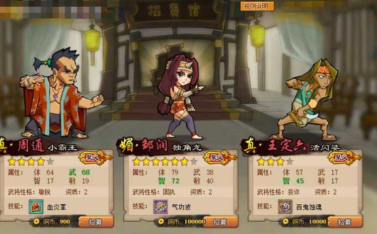 - **新手武将搭配**:10级前,首推二娘、周通、曹正组成攻速流PK阵容。二娘的技能能为任意己方武将恢复100点怒气,大幅缩短攒怒所需回合;周通的失缶掌是单体爆发技能;曹正的蓄力技能可让自身攻击力提升150%,效果持续2回合。另外,也可以搭配焦挺、李定、周通(或施恩、大虫)组成血盾流PK阵容——焦挺血量厚实,李定的单体输出在前期表现强劲,周通攻击属性突出。