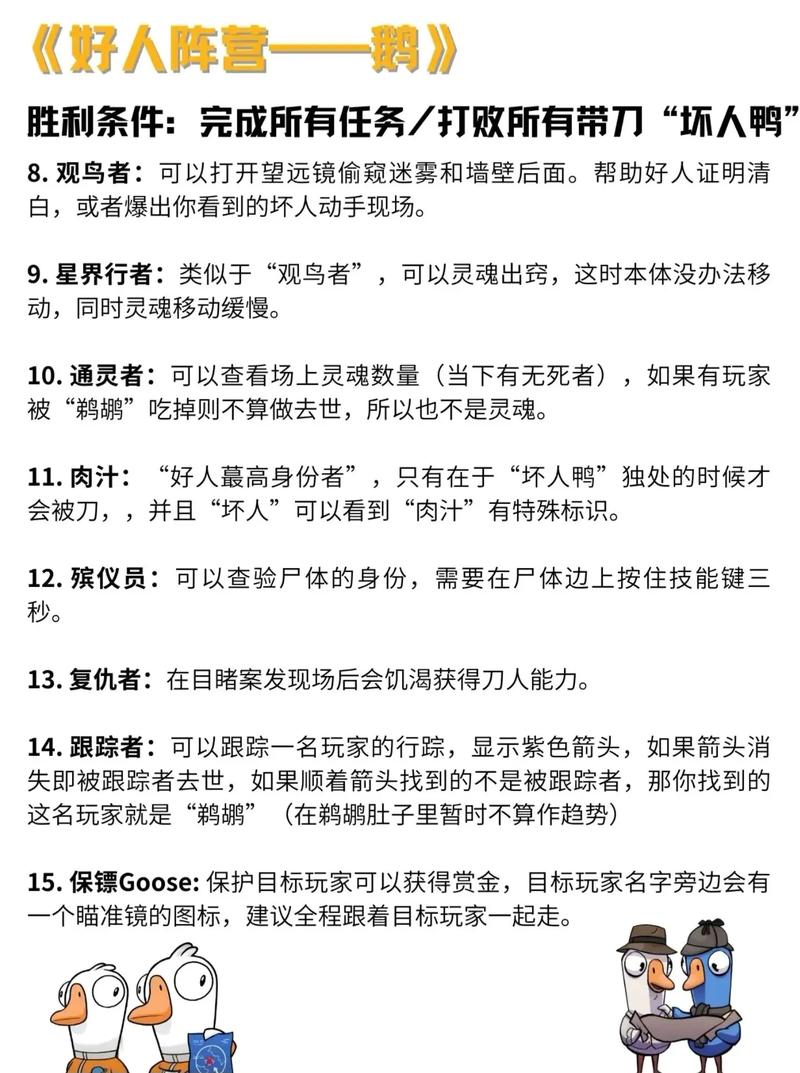 鹅队玩家得拧成一股绳,靠讨论和分析锁定鸭子与中立角色,再通过投票把他们淘汰出局;鸭队玩家则要藏好自己的身份,想尽办法混淆视听、带偏鹅队的判断,找准时机出手除掉鹅队里的关键成员;中立阵营的玩家目标各不相同,有的要帮鹅队赢,有的得助鸭队获胜,还有的需要独自活到游戏结束才能达成目标。