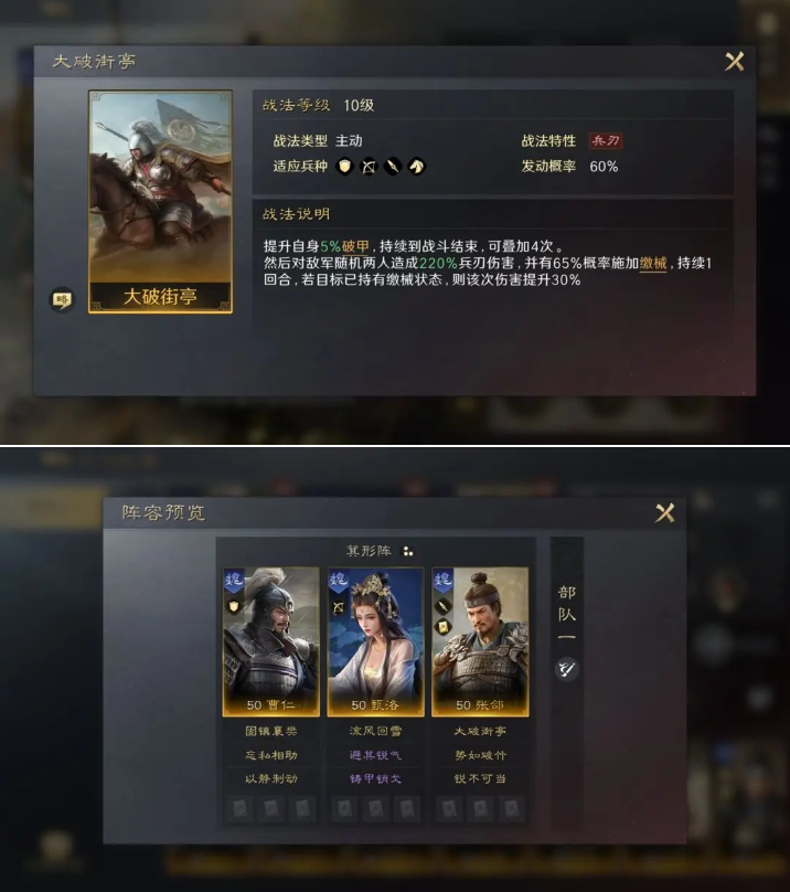 组合思路:【锐不可当】能够提升武将破甲和造成伤害,搭配【大破街亭】能够大幅度提高张郃的输出能力。