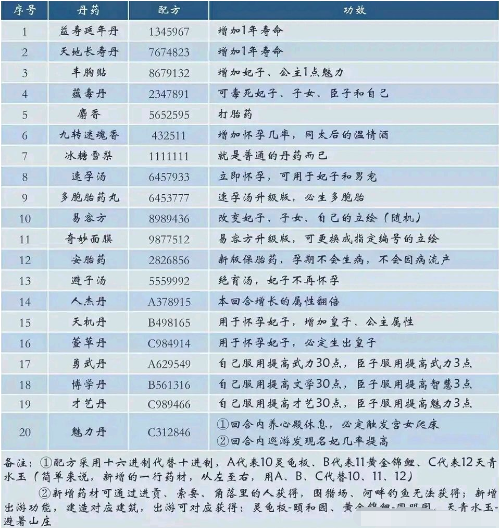在皇帝成长计划2中,制作丹药需要了解对应丹药的配方,各丹药的效果也不同,那么皇帝成长计划2丹药配方有哪些?对丹药配方感兴趣的话,下面来看看皇帝成长计划2丹药配方汇总2024吧。