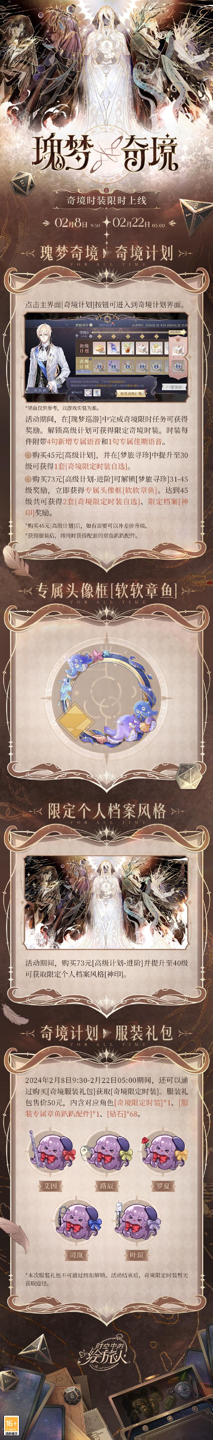 【仙境计划】将于2月8日09:30至2月22日05:00开放,完成限时任务即可获得奖励。 【wonderland】时尚单品同步上架。每件时尚单品均配有4 条新语音、1 条节日语音以及配套的章鱼派对配饰。可通过解锁【高级方案】或购买礼包获得。