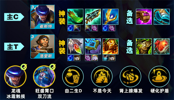 主C崔斯特:技能拥有混合伤害+控制,蓝牌回血、红牌AOE、黄牌单体点控,需要高攻速快速释放技能,成为全场输出核心。