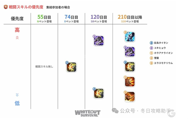 战斗类宠物的优先级较高,尤其是泰坦大鸟和雪豹,它们在参与集结战斗时会提供极大的帮助。雪猿则在后期的战斗中尤为重要。