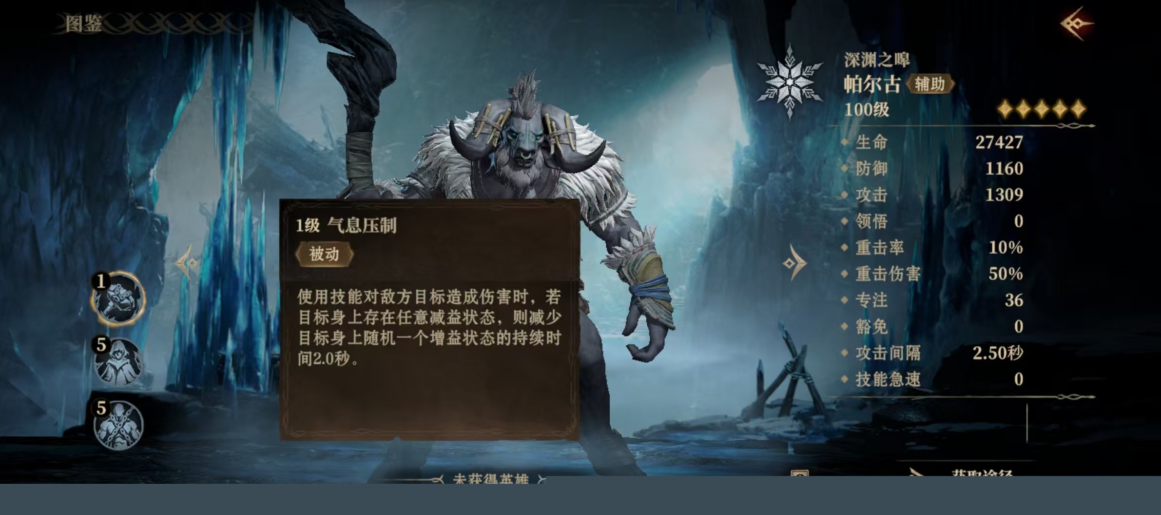 帕尔古并不具有队长技能,它的被动气息压制,在使用技能对敌方目标造成伤害时,如果目标身上存在任何减益状态,都能够随机减少目标身上一个增益状态的持续时间两秒钟。该被动需要重点了解,它并不是将增益状态直接取消掉,而是降低持续时间,这一点大家在使用时要注意,这样的效果也就降低了该被动的价值。
