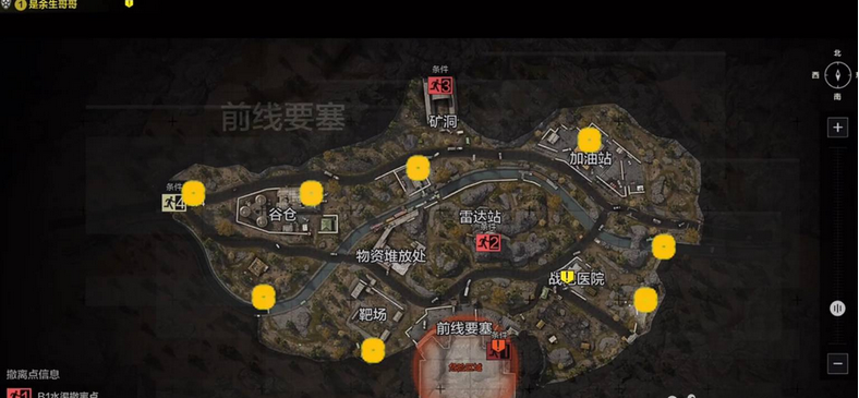 1、暗区突围前线要塞不用讲哪里能出稀有物资,前线要塞这个地图,每个地方都有稀有物资,主要注意的是玩家的出生点,玩家的随机出生点有八个。如下图所示。