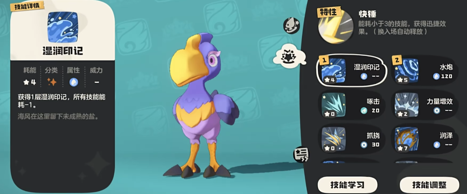 首先先看看锤头鹳的面板属性,它的生命、攻击等一系列属性都是属于精灵中的中间位置,没有特别优势的属性点但是也没有很明显的劣势,它的技能主要是以回能量、减能耗为主的,同时再搭配上一些能够增加自己攻击力的技能,能让己方在短时间内出手更多次并且释放出更多有威力的技能,这在玩PVP和对手进行博弈的时候尤为关键,尤其是它的湿润印记技能,可以对己方全员进行增益,效果持续时间还长,非常好用。