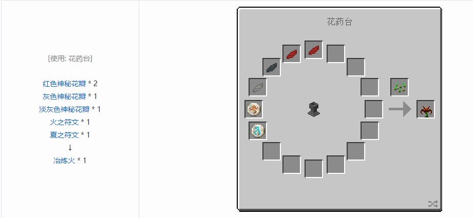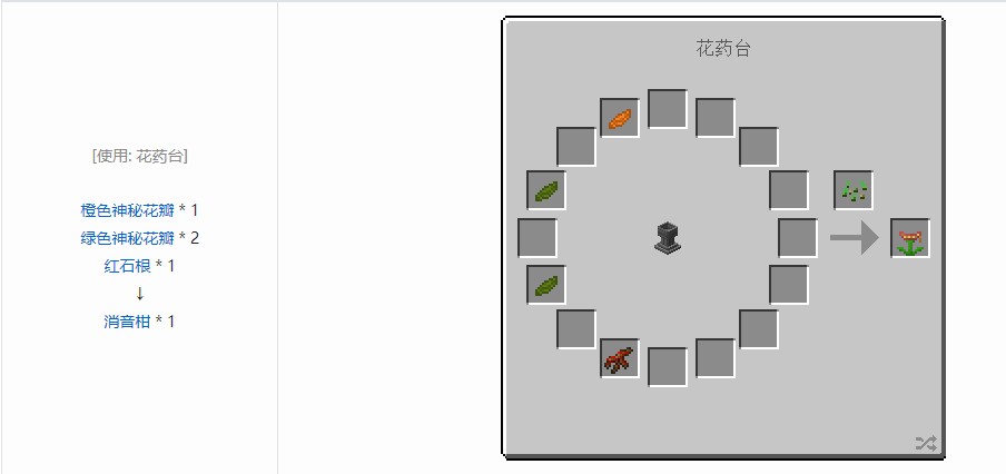 将弱磁兰投入炼金催化的魔力池,可以合成小弱磁兰。小弱磁兰的范围为以花为中心的半径为 1 的球体。