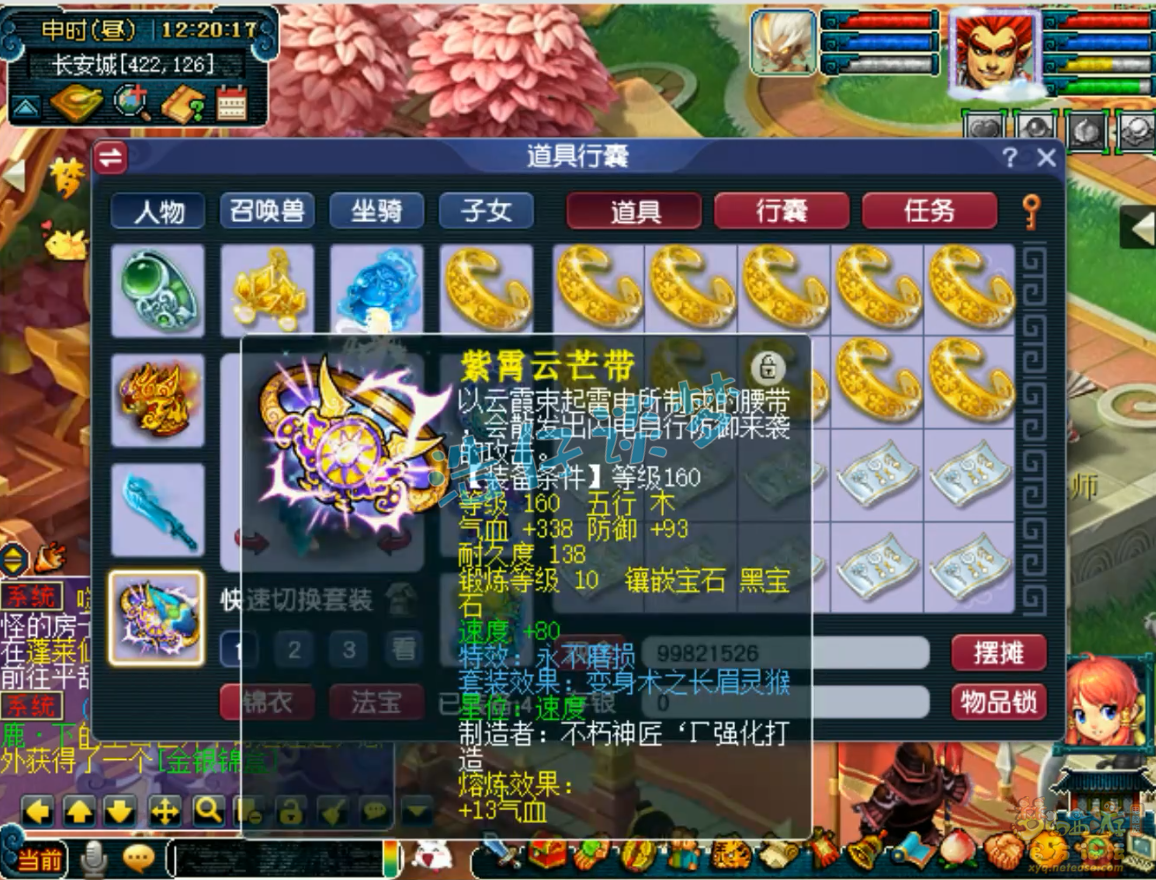 160级永不磨损变身术之长眉灵猴腰带,打了10锻黑宝石。
