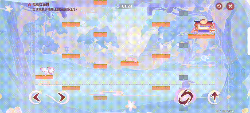 然后,等经过油豆腐之后,切换到白天,然后跳到有油豆腐的平台这里吃掉油豆腐,然后等最右侧这个升降平台重新出现,然后往上跳,跳上来之后,切换到黑夜。最后,您到最右上方这个平台,切到白天进门。