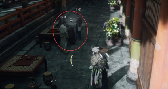 1、触发后对话前面的小孩【葛芒】之后来到九流门伞下驻地(图示位置);