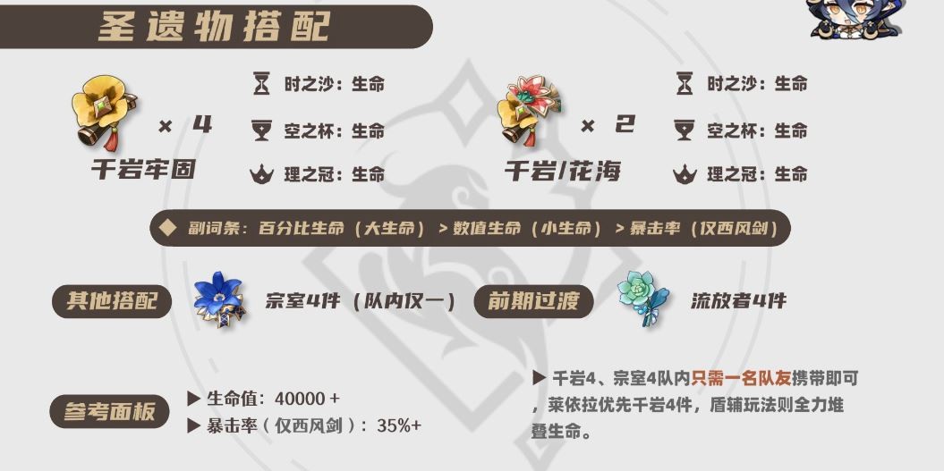 套装优先【千岩牢固】4件,也可“生命2+2”的散搭,并全力堆叠生命。