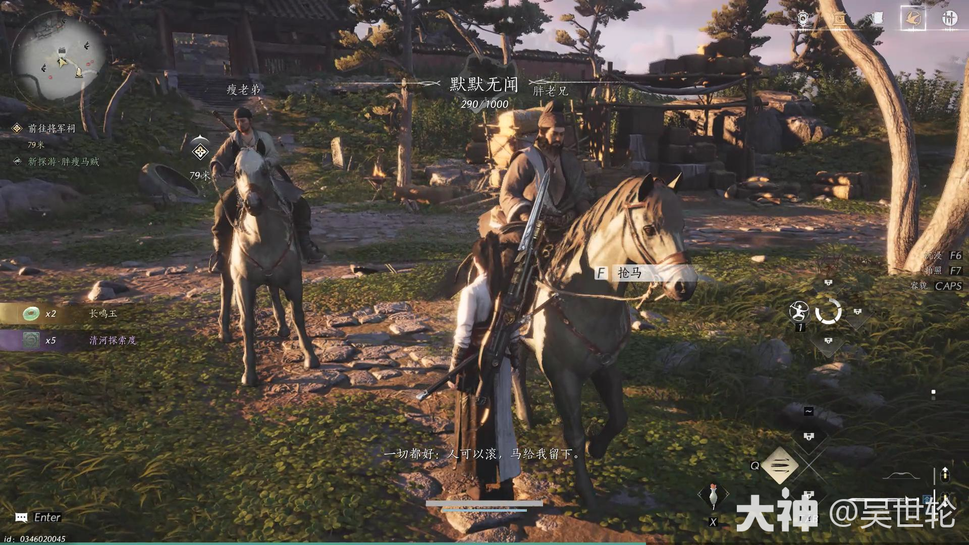 1、前往将军祠,到将军祠时的路上会看到胖瘦马贼,可略过,也可阻止其偷马,其间骑上马即可解锁坐骑。后续按「6」可召唤马匹;