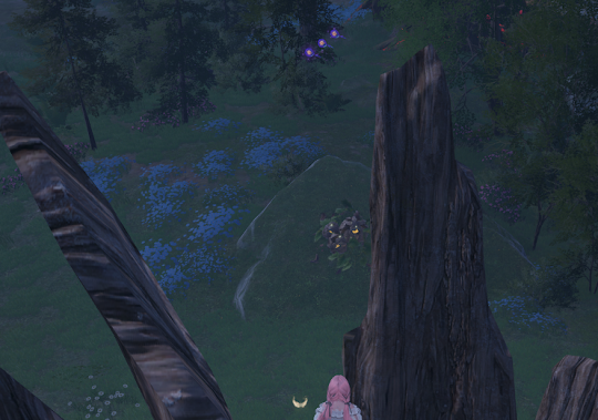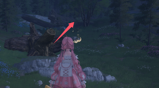 落地后往正西方向走,在图中标记树干,有两颗露珠跟一个宝箱