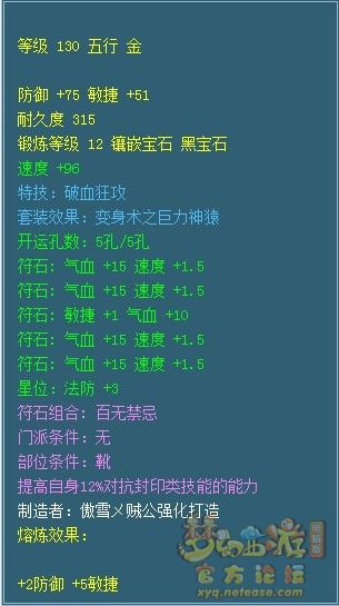 靴子方面可以选择高属性不要特技的,比如图中的63敏捷加92防御的爆炸基础属性靴子就可以弥补很多属性上的不足。靴部位的符石不用对说肯定是选择百无禁忌抗封,5孔打好符石增加12%的抗封印,可以说让对面封系很头疼了。